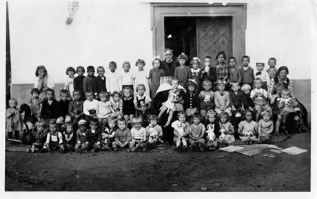 Našla ke mně cestu tato fotografie. Na obr. je pouze její výřez, na originále je 50 dětí, řádová sestra, dvě ženy v civilu a kněz – tehdejší zašovský farář P. Heřnan Štíhel. Právě osoba kněze pomůže s hrubou datací fotky, protože P. Štíhel přišel na zašovskou faru v roce 1940 a již v roce 1946 zemřel. Jedná se zřejmě o děti mateřské školy, kterou zde jako službu zaměstnaným matkám provozovaly v rámci Ústavu sv. Josefa řádové sestry.